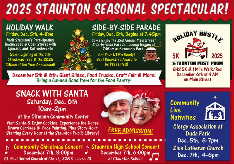 On Friday, enjoy the Holiday Walk and the 1st Annual Side-By-Side Parade on Main Street. Saturday, run/walk in the Staunton Post Prom Holiday Hustle and Snack with Santa at the Oltmann Coummnity Center. Enjoy the Lighting of the City Christmas Tree, the Lighting of Duda Park and more!
