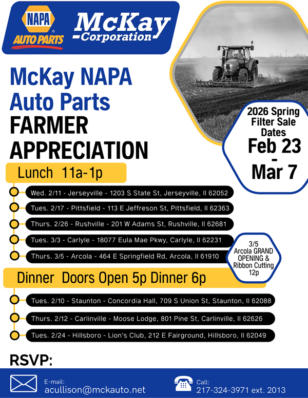 McKay NAPA Auto Parts would like to extend an invite to all of our local Communities and their members to our upcoming Farmer Appreciation Lunches and Dinners. View the flyer for dates, times, and locations of all the upcoming events!! If you are interested in setting up at your local event, we would love to have you! Please reach out and we can get that coordinated!2025 SCC Monthly Meetings & Sponsors